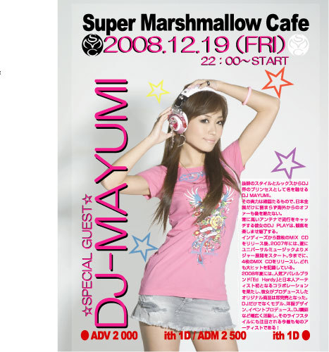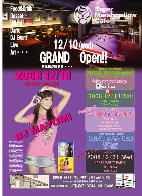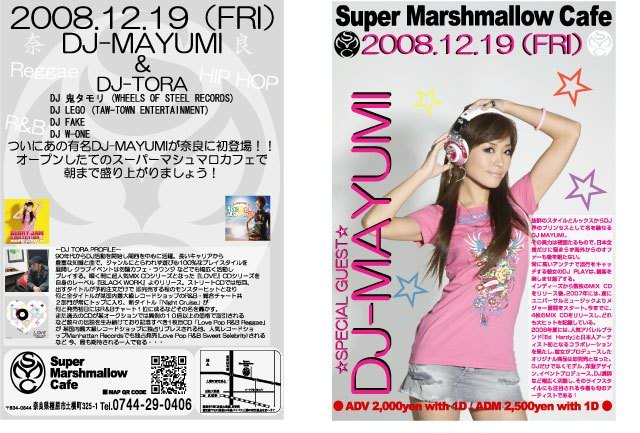 管理人様、告知失礼致します 先週 橿原にオープンしたカフェ 『Super Marshmallow Cafe』で DJ MAYUMIが ついに 19日 (金) 奈良に初登場です 12/19 (金) 遂にDJ-MAYUMIが奈良に初登場 「 DJ-MAYUMI IN DA HOUSE」 奈良 @Super marshmallow cafe 22:00〜START GUEST DJ DJ MAYUMI DJ TORA 鬼タモリ LEGO FAKE W-ONE 前売り \2,000円(1D付き) 当日 \2,500円(1D付き) 『Super marshmallow cafe』のコミュニティも有りま〜す http://mixi.jp/view_commun