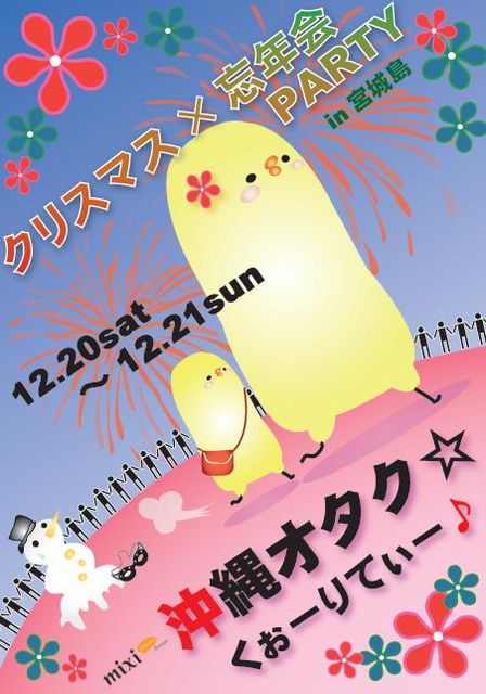 お久しぶりです、し〜らいんです(´∀`) 9月のペンションでは予想以上の反響がありビックリしました(゜Д゜) 参加してくださった皆様には感謝です^−^ ↓9月に行われたペンション企画↓ http://mixi.jp/view_event.pl?id=34166048&comm_id=2020045 ↓ペンションのイベレポ↓ http://mixi.jp/view_bbs.pl?id=35271991&comm_id=2020045 っと前置きが長くなってしまいましたが! 前回、忘年会トピックでもお話した通り、12月20日に今年最後の沖オタイベントを開催します。 今回のイベントもグダグダで定評なし〜らいん+が企