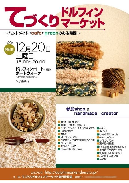 12月20日(土曜日)15:00〜20:00 鹿児島市本港区ドルフィンポートにて 第4回てづくりドルフィンマーケットを開催いたします ・ハンドメイド作家さんの手作り作品 (布小物、お洋服、木工作品、ビーズアクセサリー、ガラス、革細工などなどのハンドメイド全般) ・ハンドメイドの材料(はぎれ・レースやボタン、その他ハンドメイドに関する材料 キットの販売など) このほかにも ・自家焙煎のこだわりの美味しいコーヒー ・手作りのお菓子やパンの販売 ・お花やグリーンなど植物の販売 などなど ハンドメイドに