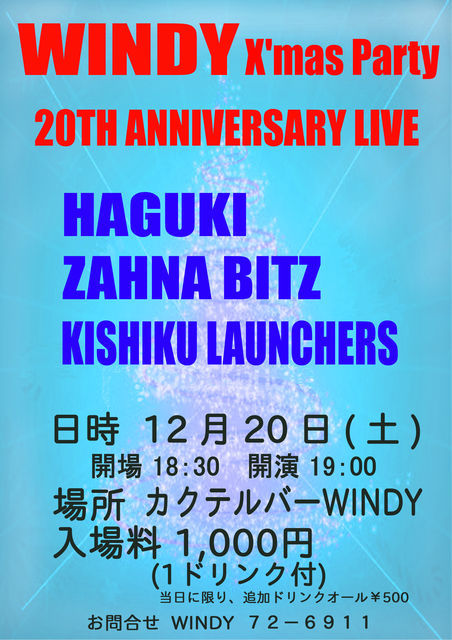 カクテルバー・WINDYの20周年のお祝いとクリスマスをかねてパーティ・ライブをします。 WINDY 20TH ANNIVERSARY LIVE 日 時 平成20年12月20日(土) 18:30開場 19:00開演 場 所 カクテルバーWINDY 入場料 1,000円(1ドリンク付) 追加ドリンク・オール500円! 出演バンド HAGUKI ZAHNA BITZ(featuring ぴろ吉) KISHIKU LAUNCHERS 他いろいろ(前座を企画中) HAGUKIさんは奈留で活動しているバンドで始めてお目にかかるバンドです。 ザーナはハーツのピロ吉さんをヴォーカルに迎えていままでと一味違