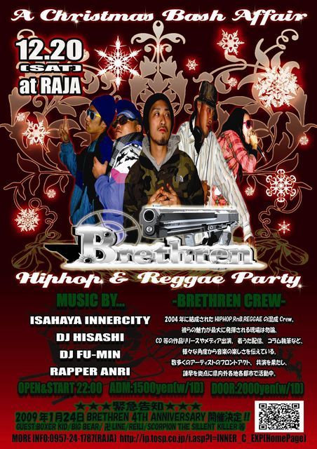 告知失礼します! 2008.12/20(土) 【BRETHREN】 atRAJA(諫早) Start22:00 ADV:1500yen(w/1D) Door:2000yen(w/1D) Music by ISAHAYA INNERCITY DJ HISASHI DJ FU-MIN RAPPER ANRI MORE INFO 0957241787(RAJA) http://ip.tosp.co.jp/i.asp?I=INNER_C_EXP(HP) 満員御礼!! 2008年最後のBRETHRENは 12/20(第三土曜日)RAJAにて開催です!! 年末締めくくりの12月、 クリスマス間近! 全員ガッチリ盛り上がっていきましょう! 今回は 1/24に開催されるBRETHREN四周年PARTYを前に (guest:BOXER KID