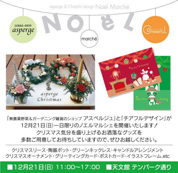 今度の日曜日、Noel Marcheと題して、テンパーク通り(彦一だんごがある通り)に本名町にある自宅ショップaspergeが一日限りオープンします! 今回のメインは、クリスマスグッズ!とってもかわいいリースやクリスマスキャンドルもお安く販売します。 そして!! かわいいクリスマスカードやオブジェをつくっているCheerful Designさんとのコラボ出店です。 朝採りの無農薬野菜や、EM卵などもだしますよ〜 珍しい脅威のお野菜ヤーコンも販売いたします。 もちろん、人気イラストレーターmariちゃんのカード類も販売するので、mariち