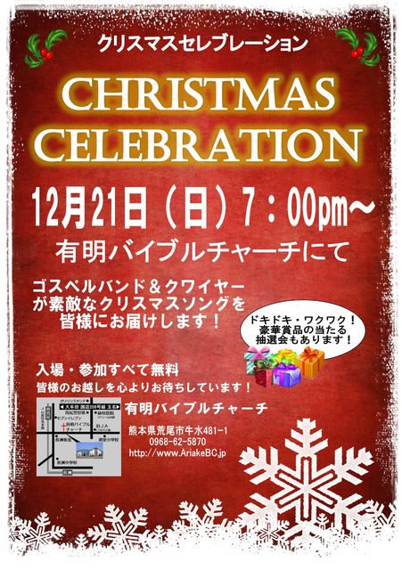ゴスペルバンド&クワイヤーが皆様に素敵なクリスマスソングをお届けします。ヒップホップダンスショー、ゲーム、などなど、楽しいプログラムがいっぱい!!!! また、プログラムの最後には、わくわく!どきどき!抽選会も行われます。 入場・参加すべて無料です。お時間のある方はご家族とともに、ぜひ足を運んでみてください! 場所:有明バイブルチャーチにて (208号線を玉名方面に向かって、荒尾警察署の角を右に曲がり、まっすぐ道なりに行きます。4つ角信号に当たりますのでそこをまた右に曲がり、300m直進すれば、右手に教会があり