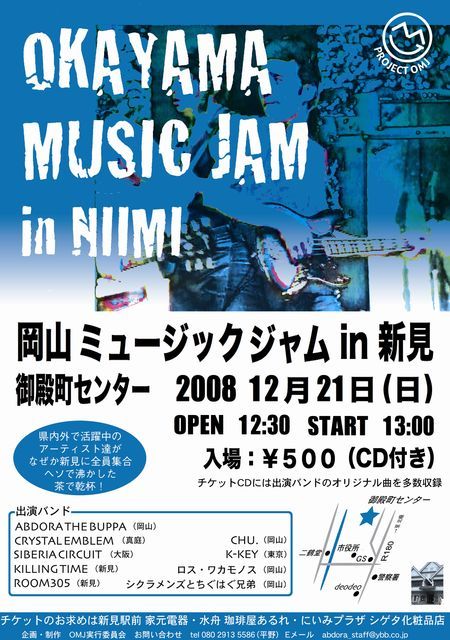 すみません、本日です! お近くの方はぜひぜひ、よろしくお願いします! 12/21(日) 新見 御殿町センター 『OKAYAMA MUSIC JAM in NIIMI』 OPEN/START 12:30/13:00 TICKET \500(1CD付) 出演: CHU. (岡山) KILLING TIME(新見) ROOM305(新見) CRYSTAL EMBLEM(真庭) SIBERIA CIRCUIT(大阪) K-key(東京) ロス・ワカモノス(岡山) ウタノネ(倉敷) ABDORA THE BUPPA(岡山) STICK OUTS(新見) シクラメンズとちぐはぐ兄弟(岡山)