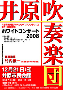 井原吹奏楽団メルヘンウインドアンサンブル 創立15周年記念 ホワイトコンサート2008 ○主な曲目 三角帽子(ファリャ) エルザの大聖堂への行進(ワーグナー) 松田聖子ヒットメドレー 他 ○客演指揮 竹内俊一(兵庫教育大学大学院教授) ○日時:2008年12月21日(日)開場13:30 開演14:00 13:30よりロビーコンサートを行ないます。 ○場所:井原市民会館 ○整理券必要(有料)前売り券400円 当日券500円 中学生以下無料 ○お問い合わせ 0866-62-3490(矢吹楽器) 矢吹楽器(http://www.ib