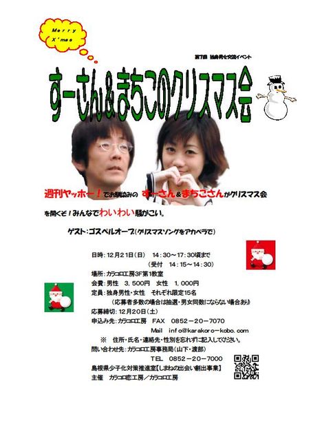 第7回カラコロ恋工房企画 「すーさん&まちこのクリスマス会」 TSK『週刊ヤッホー!』でお馴染みの「すーさん」と「まちこさん」がクリスマス会を開くぞ。 みんなでわいわい騒がこい。 ゲスト:ゴスペルオーブ(クリスマスソングをアカペラで楽しもう) ○日時 12月21日(日) 14:30〜17:30頃 (受付14:15〜14:30) ○場所 カラコロ工房3階第1教室 ○会費 男性3,500円 女性1,000円 (軽食・ドリンク&その他特典付) ○定員 独身男女 それぞれ限定15名 ※応募者多数の場合は抽選・男女同数に