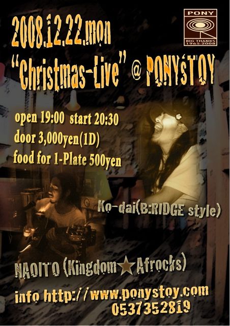 さてさて みなさんいかがお過ごしですか? X'masも近い来週月曜日は@PONY'STOY 今回はKo-dai(B:RIDGE style) & NAOITO(Kingdam☆Afrocs) 2人?いや3人?4人??? によるアコースティック・ライブを行います! PONY'Sの店内もX'masっぽく?デコなんかしちゃいます。 良かったら遊びに来て下さい! 12.22.mon. Ko-dai & NAOITO@PONY'STOY X'mas アコースティック・セットライブ open 19:00 start 20:30 door \3000w1d food for 1-Plate \500 なお会場の都合上40名限定(座席25)となります。 人数に達した場合、当日入場が出