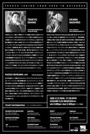 管理人様、告知失礼いたします。 不適切でしたら削除お願いします。 "SLIP OUT -TAKKYU ISHINO TOUR 2008-" @ DEAMS FLEX-MUNCHEN(静岡) DATE: 2008.12.22(Mon)/21:00 Open PLACE: DEAMS FLEX-MUNCHEN(静岡) MAP: http://www.df-munchen.com/store/company.html CHARGE: adv:3,000yen door:3,500yen (ドリンク別途) GUEST DJ: TAKKYU ISHINO GUEST VJ:UKAWA NAOHIRO LIVE: KAZUO ISHIKAWA(Void) DJ: KATSU/KAZUYOSHI/AONO/KO☆ZI VJ:KRAK TICKET INFORMATION: [DEAMS FLEX-MUNCHEN] TEL/054-273-6866 h
