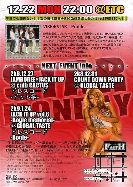 VIBESTAR presentsの不定期月曜ダンス 次の日 祝日ですよーー 前回の1回目はダンスダンスダンスで かなりあちー夜でしたっ 月曜日から朝まで踊り明かしましょー 懐かしのダンスチューンから、ブランニューまで、地元サウンドマンが踊らせてくれます お楽しみにっ STAR MONDAY OPEN22:00〜 @ETC ADM:男の子¥1500 女の子¥100