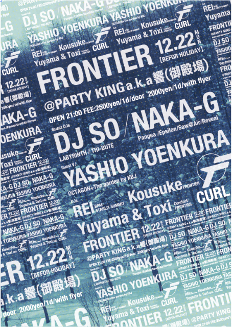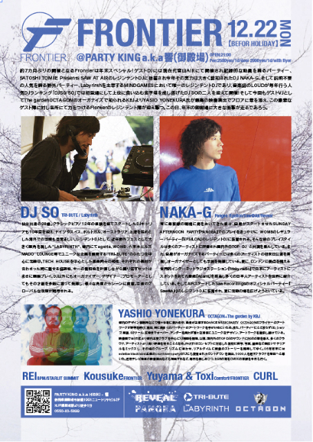 管理人様、告知失礼致します。 約7カ月ぶりの開催となるFlontierは年末スペシャル!ゲストDJにはロンドンに拠点を構える世界的インターネット ラジオステーション『frisky radio』で日本にアーティストにスポットをあてた番組『Azami』を担当し現在代官山AIRにて開催され記録的な動員を誇るパーティー、SATOSHI TOMIIE Presents SAW AT AIRのレジンテントDJにも抜擢され今年その実力は大きく認知されたDJ NAKA-G、そして説明不要の人気を誇る野外パーティー、Labyrinthを主宰するMINDGAMESにおいて唯一のレジンテントDJであり、音楽誌のLOUDが毎