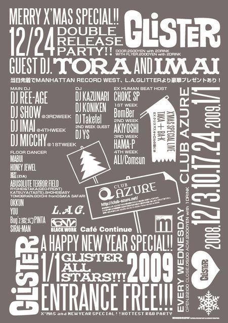 告知失礼します! ★GLISTER@club AZURE"X'mas SPECIAL"★ 2008年も絶好調です☆ 毎週水曜日、良質のR&Bを皆様にお届けします 大阪CLUB AZUREにて毎週水曜日開催【 GLISTER 】 平日にも関わらず毎週200人近くのお客様に遊びに来ていただいています!! 本日は"X’mas SPECIAL!!!" ゲストDJに"DJ TORA""DJ IMAI"、ライブゲストに"TAKA+BA-K" を迎えてスペシャルな内容でお送りします!!! 水曜日は”GLISTER”@club AZUREに決まりです!!!!! この告知をご覧の方へ ■■■■■■■■■