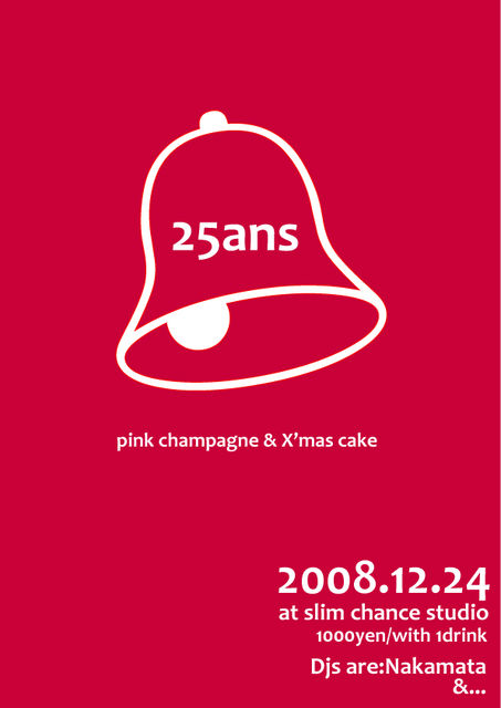 今日の今日ですが。 今年で9年目となるイベント「25ans」。 始めは24日に24歳の僕が1人でDJやるっていう 「24歳の国」てタイトルでスタートしました。 年とってますね。 おかげさまで9周年! 今年もケーキとシャンパンをご用意して 皆様のお越しをお待ちしております! 25ans @slim chance studio open21pm 1000yen/with 1drink&pink champagne&cake&sweets! DJs are: Nakamata&...
