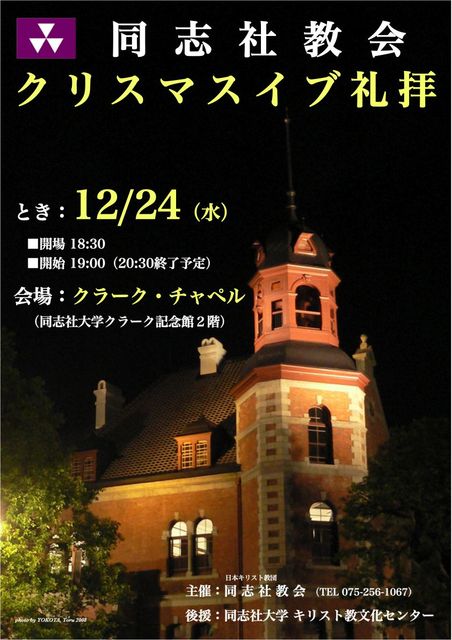 同志社の学園教会である同志社教会では、今年のクリスマスイブ(12/24)礼拝を、修復成った同志社大学クラーク記念館(重要文化財)2階のクラーク・チャペルで行います。普段、チャペルアワーなどでしか立ち入ることのできないチャペルで、本格的なキリスト教の礼拝をともに味わってみませんか。 主 催:日本キリスト教団 同志社教会(075-256-1067) 後 援:同志社大学 キリスト教文化センター 場 所:同志社大学クラーク記念館2階 クラーク・チャペル (構内図:http://www.doshisha.ac.jp/access/ima_campus.html)