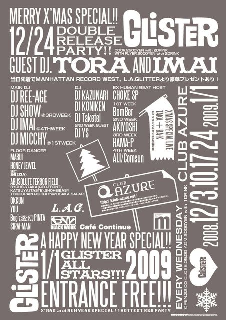告知失礼します! 毎週水曜日CLUB AZUREにて開催中のGLISTER! 12月24日水曜日はX'MAS スペシャルと題して! TAKA+BA-KのX'MASスペシャルLIVEがあります! クリスマスにクリキャロ聞きたいっていう皆さん! 是非AZURE GLISTERにお越し下さい! きっと皆で過ごすクリスマス素敵な夜になること間違い無し! よろしくお願いいたします。