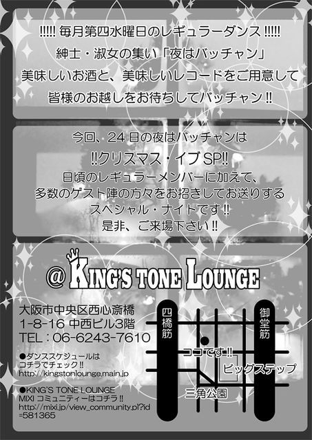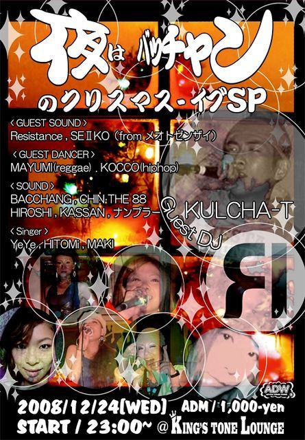 START/23:00 ADM/\1,000- <GUEST DJ> KULCHA-TEA <GUEST SOUND> Resistance SE?KO(from メオトゼンザイ) <GUEST DANCER> MAYUMI(reggae) KOCCO(hiphop) <SOUND> BACCHANG CHIN THE 88 HIROSHI KASSAN ナンプラー <Singer> YeYe HITOMi MAKI AT.KING'STONE LOUNGE 大阪府(中央区西心斎橋 1-8-16 中西ビル303)