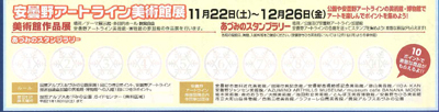 アートライン美術館展にあわせて、またまたスタンプラリーを行っています!! 恒例の景品も毎年各館から集められていますので、ぜひご参加ください。 加盟館の幅広く様々な作品が並びます。冬の安曇野へお出かけください。 会期:2008年11月22日(土)から12月26日(金)まで スタンプラリー:冬季開館加盟施設で実施しています。(豪華プレゼント多数??) ポイントを集めて、1月31日までに公園窓口へ台紙をお持ちください。