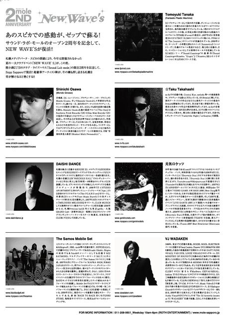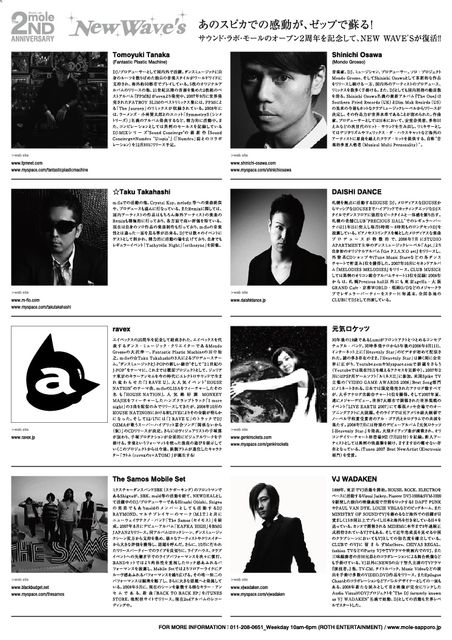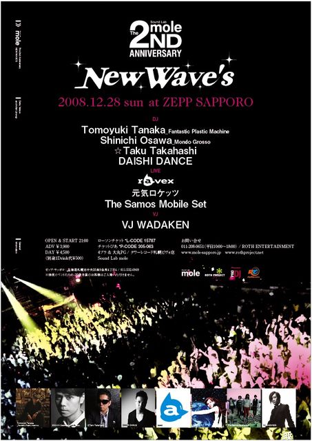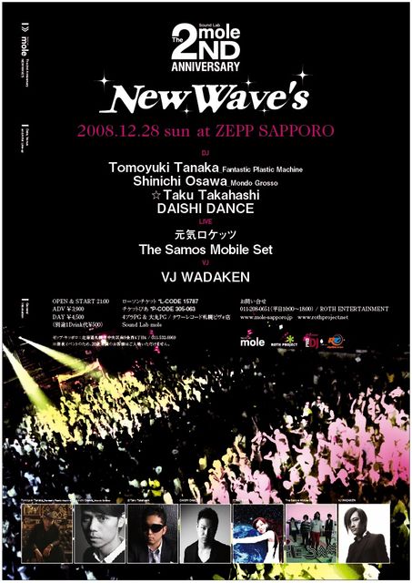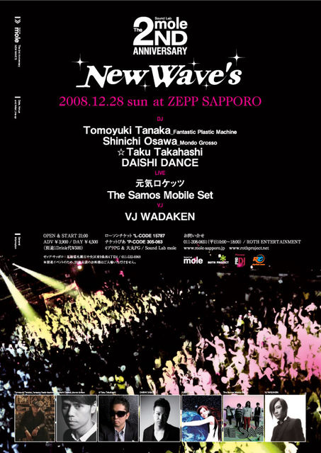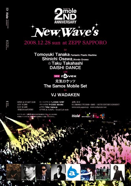 札幌メディアパークスピカの閉鎖により今年は開催されなかった 夏の一大クラブイベント「NEW WAVE'S」が今年の最後を締めくくる年末に 札幌狸小路2丁目のライブハウス・クラブ「Sound lab mole」の 開店2周年を記念して、Zepp Sapporo で復活!!!!!!!! 超豪華アーティスト陣を迎え年の瀬も押し詰まる札幌を、 ロォォォォォォックオォォォォォン!!!!!!!!!!!!! あの夏の感動が、新たに感動を巻き起こす!!!!!!!! これは見逃せない!これは見逃せない!!見逃したら年を越せない。。。??? 2008.12.28(