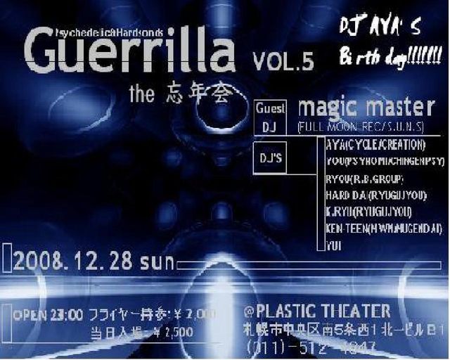 告知失礼します GUERRILLA VOL,5 in DJ AYA Birthday/忘年会 12月28日(SUN) ビラ持参:2,000YEN 当日 :2,500YEN GUEST DJ magic master(fullmoonrec/αーzone/s.u.n.s) DJ's AYA(NUTEK/CYCLECREATION) YOU(珍幻祭/彩乃実) RYOU(R.B.GROUP) HARD DAI(竜宮城/a.k.aAnime DAI) Yui(FREE) k.ryu(竜宮城) KEN-TEEN(無限大/MWM) @PLASTIC THEATER 南5西1北一ビルB1 (011)512ー4847 毎月最終日曜日を基本とし開催され
