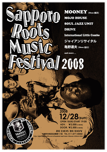Jumpin'Jive、jumpBluesをこよなく愛する日本ルーツミュージックシーンの雄、 MOONEYが札幌の地でプロデュースする一大イベント 『札幌ルーツミュージックフェスティバル2008』! 昨年に続き2度目の開催です! 今年は札幌のみならず、旭川からもルーツミュージックをこよなく愛するミュージシャン達が 多数集結! ジャンピン・ジャイヴは勿論、ジャンプブルーズ、トラッドジャズ、アメリカンフォーク、 カントリー、ブルーグラス、R&B、R&R・・・ アメリカのアーリータイムを彩った、古き良き時代の温もりある音楽達に身を委ねながら、 酔