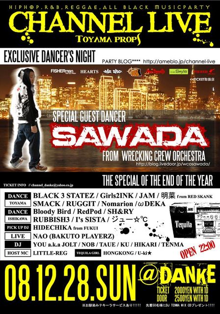 THE SPECIAL OF THE END OF THE YEAR 『CHANNEL LIVE』 -TOYAMA PROPS- 2008/12/28(SUN) @DANKE TICKET 2000YEN(1D) DOOR 2500YEN(1D) ※お馴染みテキーラサービスあり! 先着50名様にDJ TENMA MIX CDプレゼント! 【GUEST DANCER】 SAWADA (WRECKING CREW ORCHESTRA) 【DANCE】-TOYAMA- BLACK3STATEZ Girls2INK JAM 明菜 from REDSKANK RUGGIT SMACK Half M's ωDEKA 【DANCE】-ISHIKAWA- Bloody Bird RedPod SH&RY RUBBISH3 Rapid★Grow I's SISTA ジュー☆℃ 【LIVE】 NAO(BAKUTO PLAYERZ) 【PICK UP DJ】 H