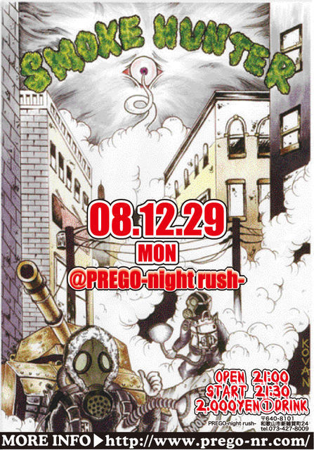 管理人様、USJ行くのいつにします? 12月29日(月)『SMOKE HUNTER』@PREGO-night rush- 前売り¥1,500/当日¥2,000(共に当日1ドリンク代¥500必要) OPEN⇒21:00 / START⇒21:30 ◆TATTOO◆ IWACH,SAMON,JUN,KOVAN ◆DJ◆ SILENT,YU-TA,SHAKER,ILL"es",航平,NARUKI ◆SOUND◆ UNIQUENESS ◆LIVE◆ スピナッチ,CENTER WRONG UNIT,アストニッシュ,J.M.T ◆SINGER◆ FLIRT. ◆DANCE◆ W.Lockin Crew,DIH LOST SOLDiER ◆FLOOR DANCER◆ 396 ◆FOOD◆ nice dreamz(dream girls) *