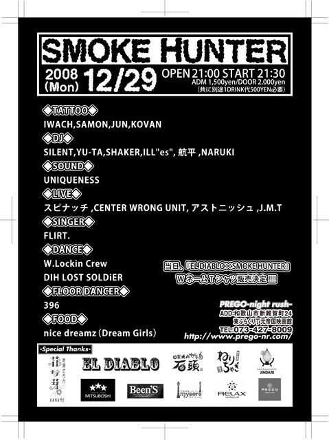 管理人様、告知失礼致します。 12月29日(月)『SMOKE HUNTER』@PREGO-night rush- 前売り¥1,500/当日¥2,000(共に当日1ドリンク代¥500必要) OPEN⇒21:00 / START⇒21:30 ◆TATTOO◆ IWACH,SAMON,JUN,KOVAN ◆DJ◆ SILENT,YU-TA,SHAKER,ILL"es",航平,NARUKI ◆SOUND◆ UNIQUENESS ◆LIVE◆ スピナッチ,CENTER WRONG UNIT,アストニッシュ,J.M.T ◆SINGER◆ FLIRT. ◆DANCE◆ W.Lockin Crew,DIH LOST SOLDiER ◆FLOOR DANCER◆ 396 ◆FOOD◆ nice dreamz(dream girls) *当日、