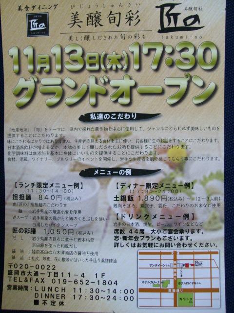連続してイベント立てています・・・。 2009年1月3日の同窓会のハガキが届いた頃かとおもいますが、 コレに参加できない人、こじんまり集まりたい人用に、12/30をご用意いたしました。こちらは、口コミですから、mixiの書き込み、もしくは、携帯で私:駒井まで。 場所は、11月13日にオープンした、山内君のお店です。 時間は、18時。お仕事などで遅れる方、連絡ください。 費用は、3500円くらいで、3時間粘れるでしょうか? そこから、一端解散して、居残るなり他へ流れるなり・・なんでもアリです。