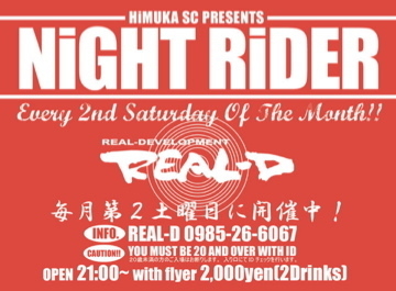 今年1年NRをサポートしてくれた皆様、ありがとうございました! 30日はナイトライダー番外編!嫌な事をこの日は全開で吹き飛ばして来年に備えましょう! HiMUKA SC PRESENTS... NiGHT RiDER"番外編" 2008/12/30/TUE @REAL-D AD or WITH FLYER 2,000yen (w/2Drinks) DOOR 2,500yen (w/2Drinks) OPEN-START 9pm~Till Morning... [HOST SOUND] HiMUKA SC [DANCER] HiEKO&U-KO iTAL☆ てげれぐCREW [EARLY WARM] KRYPTO NiGHT RiDER'S CANP TETSUYA ご来場お待ちしてます!