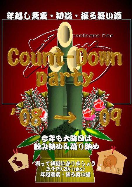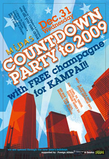 告知失礼致します。 ''COUNTDOWN PARTY to 2009'' Supported by FOREIGN AFFAIRS & GEISHA 2008年の締めくくりをMiDASカウントダウンパーティーで思いっきり!盛り上がりましょう♪!! 新年の乾杯には、ご来店の皆様全員にシャンパンをご用意しております! そして23:30までにご来店の方にはドリンク飲み放題のサービスをさせていただきます☆ 尚、カウントダウンパーティーのテーブルのご予約は、お電話またはE-MAILにて承っておりますので、お気軽にお問い合わせくださいませ。 OPEN:19:00-7: