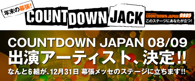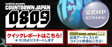 rockin'on presents 『COUNTDOWN JAPAN 08/09』 31日=開場12:00/開演13:30/終演25:00(会場閉館29:00) 出演ARTIST:オフィシャルサイト参照 ☆チケット先行受付:公式サイトにてインターネット抽選先行受付 ※期間11/1〜5 ※全券種 ☆チケット一般発売日:12月6日(土) 10:00〜 ☆Official site:http://www.rijfes.co.jp/countdownjapan/ ☆お問い合わせ:COUNTDOWN JAPAN08/09事務局 0180-993-634(24時間テープ対応、PHSからは不可)