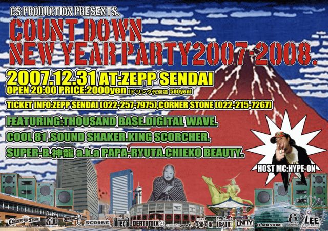 お疲れっす。何かと忙しい年末だと思いますが、大晦日はZEPP SENDAIにてカウントダウンパーティーを行います。我が輩、HOST MCです。パーティーを彩るサウンド陣も豪華にします。オールレゲェサウンドです。2008年仙台レゲェの年にしたいと思いまして、Straght! 200ハイポン。ご参加よろしくです。