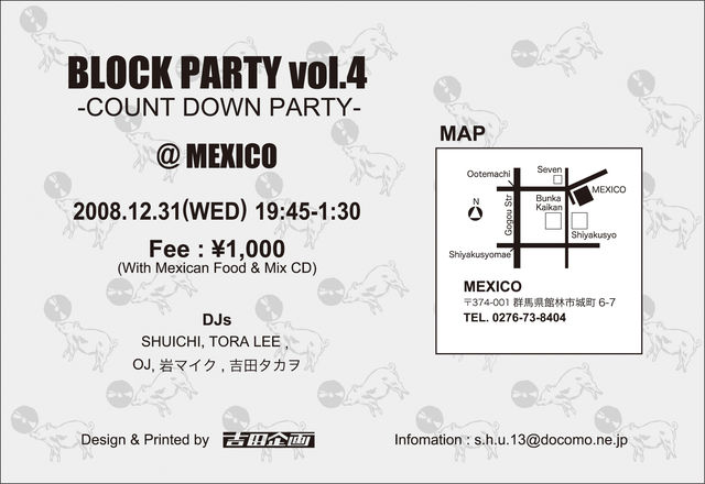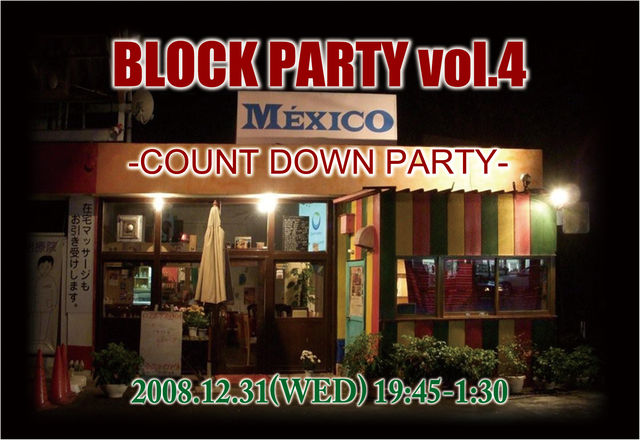 もうあと2週間で今年も終わりです 今年1年の締めにイベントを行います 【Block Party Vol.4 Count Down Party】 と題しましていつもの【MEXICO】でみんなで年越し ■ Block Party Vol.4 Count Down Party ■ 2008.12.31 19:45〜1:30 ■ 1000YEN〔With Mexican Food & Mix CD〕 ■ DJ SHUICHI / TORA LEE / OJ / 岩マイク / 吉田タカヲ ■ LIVE 大晦日はでって人も夕食を食べに来