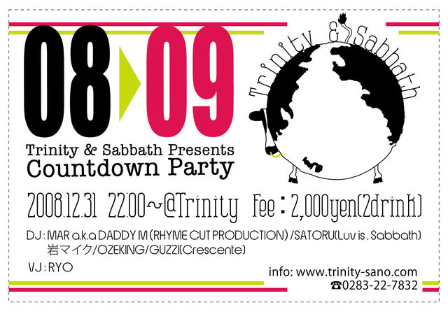 管理人様、告知失礼致します。 今年も毎年恒例のカウントダウンパーティーをTrinity(元Slow Cafe)で開催致します。 毎年、大勢のお客さんで年越しを祝う楽しいイベントです。 年に一回くらい羽目を外して、飲んで騒ぎましょう!!! 佐野近辺でお時間にご都合の宜しい方、宜しくお願い致します。 Trinity & Sabbath Presents Countdown Party 2008.12.31 22:00~ @Trinity Fee:2,000yen(2drink) DJ: MAR a.k.a DADDY M(RHYME CUT PRODUCTION) SATORU(Luv is , Sabbath) 岩マイク OZEKING GUZZI(Crescente)