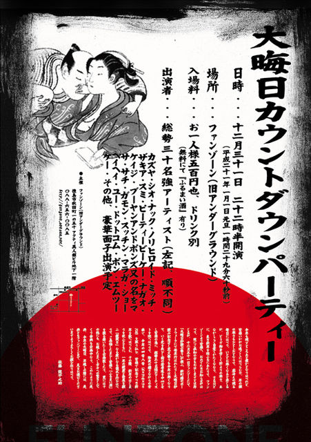 FUNZONE Presents 『大 晦 日 カ ウ ン ト ダ ウ ン パ ー テ ィ ー』 ---------------------------------------------------------- 日 時・・・十二月三十一日 二十二時半開演 <平成二十一年一月一日元旦一時間二十九分六十秒前> 場 所・・・ファンゾーン(旧アンダーグラウンド) 入場料・・・お一人様五百円也、ドリンク別 <無料にて「ふるまい酒」有り> 出演者・・・総勢三十名強アーティスト(下記、順不同) カズヤ、シオ、ナック、ノリヒロイド、ミッチ、ザキア