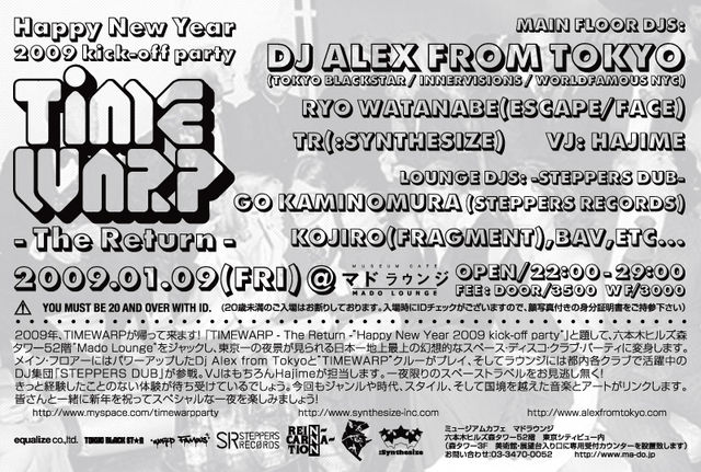 「TIMEWARP - The Return -”Happy New Year 2009 kick-off party“」と題して、