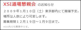 イベント告知利用させていただきます。 XSI道場にて 今回は2週目にあたる、 1月10日(土)に開催致します。 いわゆる、たんなる飲み会。 奮ってご参加ください。 cveldorado@gmail.com またはmixi内にて参加希望表明お願いします。 たぶんいけるかも〜 という人はとりあえず席だけ 入れていただけるといいかもしれません。 キャンセルは可能な限り1月8日までにご連絡ください。 開催地 高円寺ピテカンハウス 東京都杉並区高円寺南3丁目48-3 http://local.yahoo.co.jp/detail/spot/da82e2b0bb774109bf11b95be674