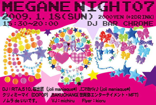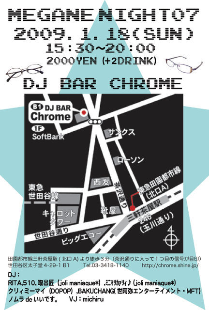 2009年 1月 メガネナイト 再出発させていただきます 『初心忘れるでべからず』と言うことでお店は三軒茶屋から徒歩5分の DJバークロームで行います 今回再出発をかねて新たな試みをしてみようと思いまして お昼から夜にかけてという時間帯でイベントを開催したいと思います イベント名 メガネナイト07 日時 2009年1月18日(日曜日) 15:00〜20:00 料金 2000円(2ドリンク付き) 必要なもの マイメガネ(伊達メガネOK) メガネを愛する心 DJ`s RITA 510 取出匠(joli maniaque*) ミニマリカァリィ♪(jo