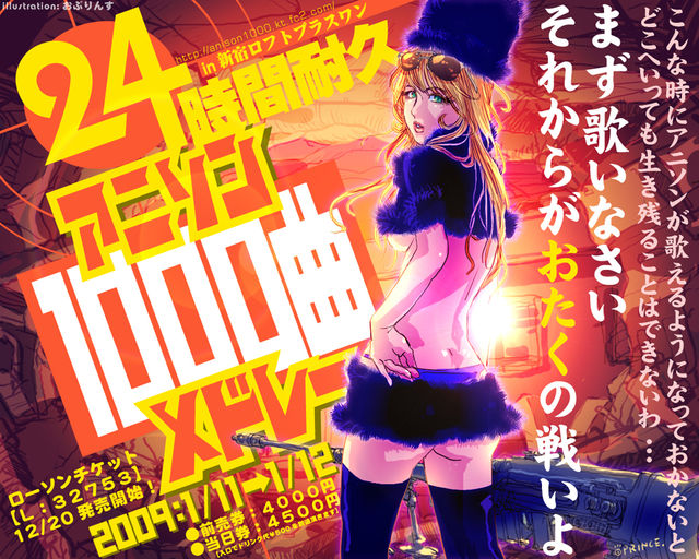 お待たせいたしました! 年に一度のアニソン大宴会 「24時間耐久アニソン1000曲メドレー〜大新年会!〜」 開催決定であります! 2009年1月11日(日)夜10:30〜1月12日(月・祝日)夜10:30 新宿ロフトプラスワンにて完全24時間開催! 前売り4000円 当日4500円 12月20日(土)前売り券発売開始 ローソンチケット>【L:32753】 新年早々アニソン三昧! 景気よく24時間歌い尽くせ!! 新作・旧作・問題作・アニメ・特撮・ドラマ・CM、魂が震えたらそれは「アニソン!」 「永久保存版アニソン読本・