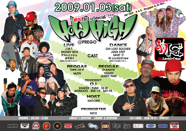 -HIP HOP . R & B . Reggae and All Mix- [HOW HIGH] @和歌山 PREGO nightrush 2009.01.03(Sat) [Hours] 22:00〜5:00 [ADV] 1,500yen . [ADM] 2,000yen (入場時、別途1D代500YEN) Resident DJ / SHAKER . FUMI . AKIRAXXX . SE-KI . BIG-10 . SAY-YA . NICK LIVE / J.M.T. . MONEY BOX . アストニッシュ . みちのく (Airtist Credit A to Z 順) Reggae Deejay / SAZIN Dance / DIH LOST SOLDiER . JUNK STEP . SAVE'IT . W.Lockin Crew (Airtist Credit A to Z 順) Reggae Dance / TRINITY . JENNY PINK
