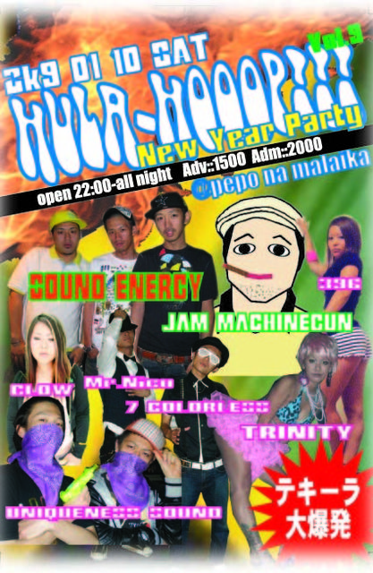広告、失礼します。 ◆◆◆HULA-HOOOP!!! Vol.9 -=-New Year Party-=-◆◆◆ レゲエ好き必見!!!和歌山一踊れるダンス!!!!! 現場で流行中の☆BRAND NEW REGGAE☆そして、誰にでもわかる☆定番REGGAE☆を中心に ☆HIP-HOP☆R&B☆も織り交ぜ、誰もが自由に遊べて楽しめるDANCE HALL!!!! ■1月10日 土曜日 @PEPO NA MALAIKA『和歌山市狐島655-3 BF1』 ■22:00〜ALL NIGHT ■チケット有り:::¥1500★チケット無し:::¥2000 ****(入場の際に別途1Drink¥500いただきます)**** ★☆★GUEST SOUND★☆★ SOUND