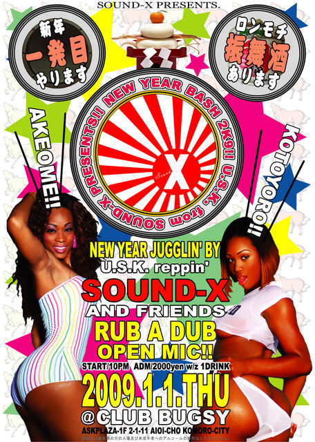 ▼コミュニティはコチラ http://mixi.jp/view_community.pl?id=3137523 謹賀新年!! 一発目!! カウントダウンの翌日は、小諸BUGSYでTHAT'S新年会ダンス!! 初詣のその足で、NEW YEAR'S CLUBBIN' しませんか!? 振舞酒!! 振舞餅!! 振舞クリ!! 更には…!? ※振舞酒は勿論!! 樽で!!(樽1斗) [REGGAE/HIP HOP/R&B/OLDIES...] SOUND-X presents. NEW YEAR BASH 2K9!! 2009.1.1.THU @CLUB BUGSY START : 10PM / CLOSE : 5AM ■NEW YEAR'S JUGGLIN' BY... U.S.K. rep. SOUND-X and FRIENDS!! ■RUB A DUB OPEN MIC!