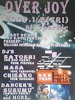 NEW YEAR DANCE MUSIC NIGHT OVER JOY 2009.1.2(FRI) at【DINDI】 電車通り思案橋側 思案橋パーキング横のビル4F 困った時は上を見上げてください 黒い看板が目に入ります Start 22:00 Fee 2000yen(with 1drink) DJ's Satoshi 【BE BOP CREW】(福岡) MASA 【joy stick】(山口) CHISAKO(長崎) Special Show Case SuSumu【BE BOP CREW】& more DANCER's... 先着20名にOriginal CDプレゼント ご来場の方にWelcome Drinkプレゼント Show Time & プレゼント抽選会