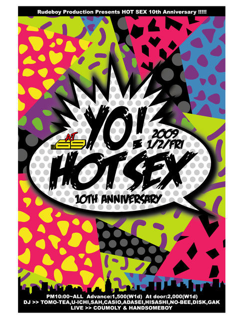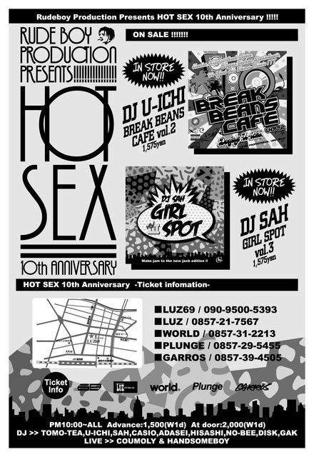 Rudeboy Production Presents 『HOT SEX』10th ANNIVERSARY [HIPHOP / R&B / BREAK BEATS] ■2009/1/2 fri 22:00- ■@LUZ69 ■DJ TOMO-TEA U-ICHI (from東京) SAH (from東京) CASIO (from中山町) ADASEI (from境港) NO-BEE (PROPSPOT) HISASHI DISK GAK ■LIVE COUMOLY & HANDSOMEBOY ■ADV 1500yen(1D) ■DOOR 2000yen(1D) ☆伝説のPARTYがついに10周年!!!!!!!!