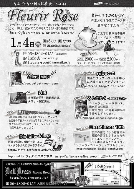 'なんでもない日のお茶会 vol, 44' 01.04.2009 (sun) @ doll dress galerie brocante open ; 16:00 / start ; 17:00 / close ; 21:00 (bar close ; 23:00) adv ; 2000yen / door ; 2500yen 司会進行 ; rebecca http://rebe.blog23.fc2.com/ dj ; velvet moon http://www.velvet-moon.com/ 占い ; 妖香 (占法 ; タロットを基本として鑑定するが、気学・四柱推命でも鑑定) 物販 ; casablanca 18th http://number-asako-setoh.com/ るなぱあく-lunapark- http://blog.lunapark.egoism.jp/ die falter fuhrte htt