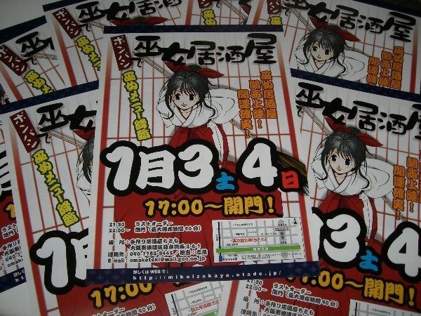 管理人様 この場をお借りして宣伝させていただきます 1月3日4日 大阪の日本橋で おまけ的企画さんとコラボで 巫女居酒屋のイベントをさせていただきます 1月3日は相咲ポッポさんと 日本橋のメイド喫茶 メルカフェのスタッフ2名で巫女さんになって営業いたします 3日のコミュ http://mixi.jp/view_event.pl?id=37587634&comm_id=2948431 1月4日はみるくぷりんのりんさん 新希咲愛さん 宮崎亜美さんを巫女さんに迎え営業いたします 4日のコミュ http://mixi.jp/view_event.pl?id=37327092&comm_id=2948431 出演