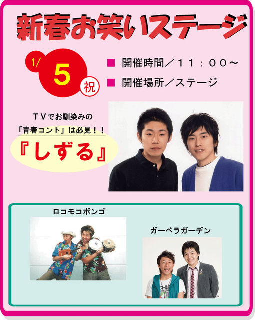 中京テレビハウジングプラザ 「しずる 新春お笑いステージ」 大人気!お笑いコンビ 「しずる」がやってきます。 青春コントは炸裂するのか?? 【出演】しずる・ロコモコボンゴ・ガーベラガーデン 2009年1月5日(月) 中京テレビハウジングプラザ 西尾会場 11:00〜 豊橋南会場 14:30〜 入場無料 お気軽にお越し下さい。 http://www.35s.co.jp/sumaiclub/