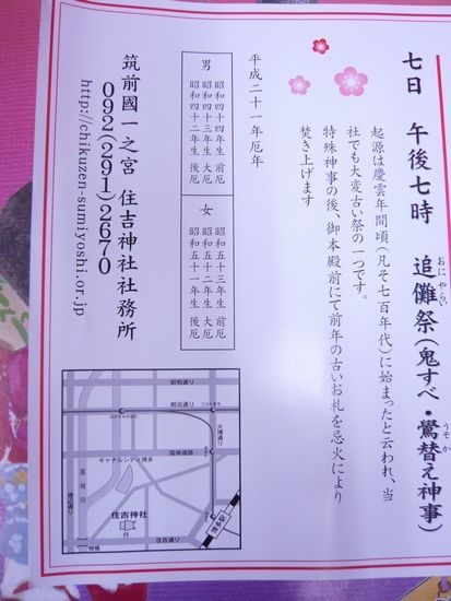 例年1月7日午後7時から博多区の住吉神社で追儺(おにやらい)祭 ご神事が厳かに 執り行われます。 太宰府天満宮の「鬼すべ神事」は知名度もあり、規模、動員数も 大がかりですが、こちらは地元住吉の人々が[鎮守の森」に集い 静かに厳粛な緊張感を共有できる夜のご神事と火祭りは不思議な 高揚感もありとても印象深いものです。 カメラを手に着物姿で参加してみられませんか 詳しくは住吉神社http://chikuzen-sumiyoshi.or.jp/
