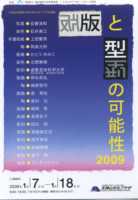 1月7日(水)から始まります。 岡山県天神山文化プラザ企画展『版と型の可能性 2009』 1月7日(水)〜1月18日(日) 9:00〜18:00(最終日は16:00まで) 岡山県天神山文化プラザ 第1展示室 http://www.tenplaza.info/ 安藤清和(写真) 石井美江(染色) 上田繁男(手漉和紙) 岡島光則(陶) かとうゆみこ(版画) 北野静樹(染色) 倉敷芸術科学大学 芸術研究科 彫刻制作研究室(彫刻) 伊永和弘(版画) 榊原啓司(陶) 島 秀佐(版画) 島村 光(陶) 関崎 哲(版画) 高原彩子(版画
