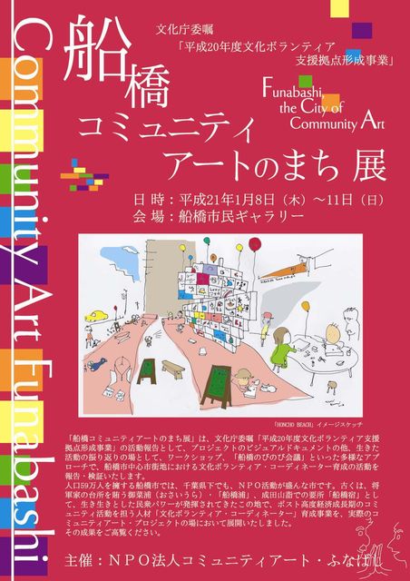 文化庁委嘱 平成20年度文化ボランティア支援拠点形成事業 船橋 コミュニティアートのまち 展 特定非営利活動法人コミュニティアート・ふなばし(理事長:下山浩一)は、文化庁委嘱 「平成20年度文化ボランティア支援拠点形成事業」の活動報告として、「船橋 コミュニティアートのまち 展」を開催いたします。 事業のビジュアルドキュメントの他、生きた活動の振り返りの場として、ワークショップ、「船橋のびのび会議」といったさまざまなアプローチで、船橋市中心市街地における文化ボランティアの活動を報告・検証いたします
