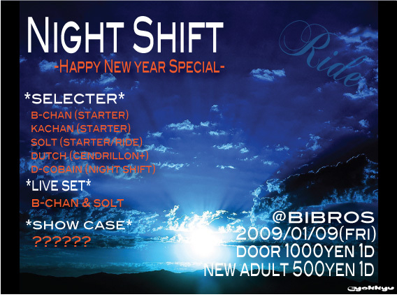 [NIGHT SHIFT] 2009/01/09(FRI) @BIBROS *pm10:00〜am4:00* 1000YEN1D NEW ADULT 500YEN 1D ★SELECTER★ B-CHAN a.k.aCyokkyu S.O.L.T KACHAN DUTCH D-cobain ★LIVE SET★ B-CHAN a.k.aCyokkyu & S.O.L.T ★SHOW CASE★ DANCER... CK CRAZYBOOGIE PATIKA ??????????????? 今回レギュラー一発目!!! 成人式も近いとゆうことでビブロスカウンターでID(誕生日がわかるもの)を提示していただくと新成人の方は500円1D!!!! 新成人のみなさん是非遊びにきてください★ もちろんマ